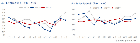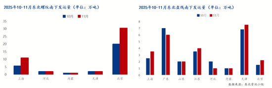 从东北建材资源南下整体情况来看,11月东北螺纹南下计划量为46.5万吨,同比减少万吨、环比增加15.8万吨,盘线南下计划量27.2万吨,同比减少5.5万吨、环比增加0.9万吨。10月东北螺纹南下实发量为30.7万吨、较计划量减少6.4万吨,同比减少10.8万吨、环比减少万吨;盘线南下实发量26.3万吨、较计划减少0.7万吨,同比减少4.1万吨、环比增加4.5万吨。