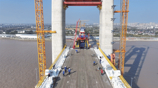 重达626吨的钢梁在浮吊船的吊装下