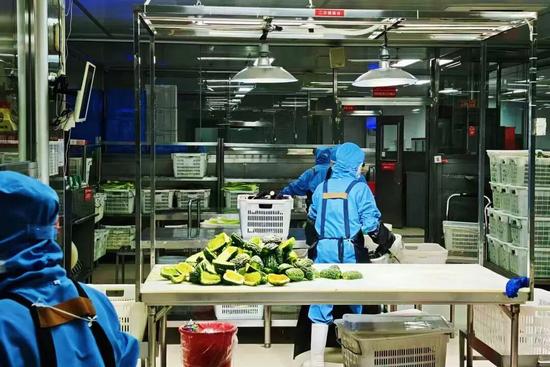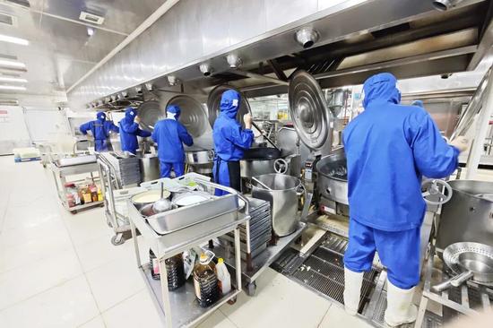 8时,管理人员在分装间入口为工作人员逐一进行手部消毒和衣物除尘。半小时后,分装间饭菜飘香。36名分装人员分成三组,随传送带依次完成盛饭、配荤素菜和杂粮等工序,很快便将套餐分装完毕。