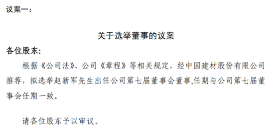 议案一:根据《公司法》、公司《章程》等相关规定,经中国建材股份有限公司推荐,拟选举赵新军先生出任公司第七届董事会董事,任期与公司第七届董事会任期一致。