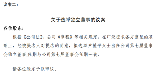 议案二:根据《公司法》、公司《章程》等相关规定,在广泛征求各方意见的基础上,经被提名人对提名的同意,拟选举尹援平女士出任公司第七届董事会独立董事,任期与公司第七届董事会任期一致。