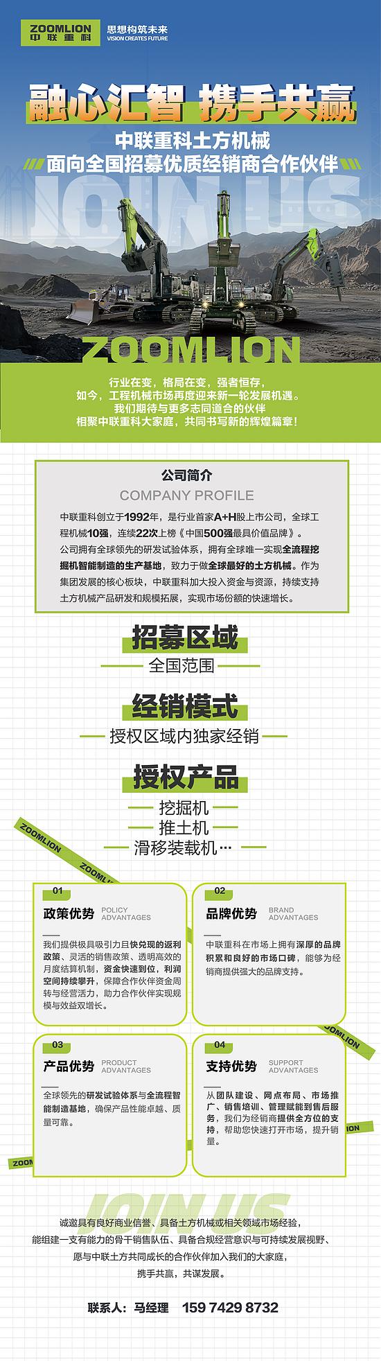 诚邀具有良好商业信誉、具备土方机械或相关领域市场经验,能组建一支有能力的骨干销售队伍、具备合规经营意识与可持续发展视野、愿与中联土方共同成长的合作伙伴加入我们的大家庭,携手共赢,共谋发展。联系人:马经理 15974298732。