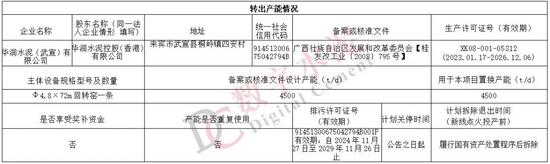 根据公示,华润水泥(封开)有限公司两条日产5625吨水泥熟料生产线项目设计产能均为5625t/d,均置换产能1125t/d,置换比例均为2:1。华润水泥控股(香港)有限公司一条4500t/d用于上述项目置换产能,该生产线计划履行国有资产处置程序后拆除。
