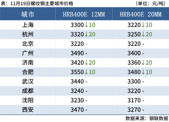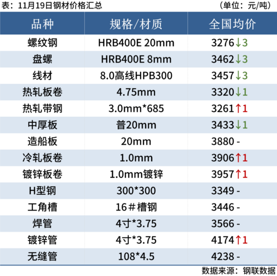 螺纹钢:1119,全国31个主要城市20mm三级抗震螺纹钢均价3276吨,较上个交易日吨。期货走弱,终端采购积极性下降,加之当前步入淡季,需求愈发低迷,市场观望心态增加,个别市场有降价销售兑现操作出现,预计20日国内建筑钢材价格或将延续偏弱震荡运行态势。