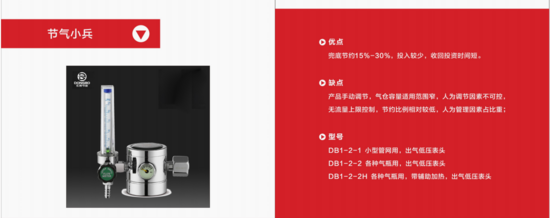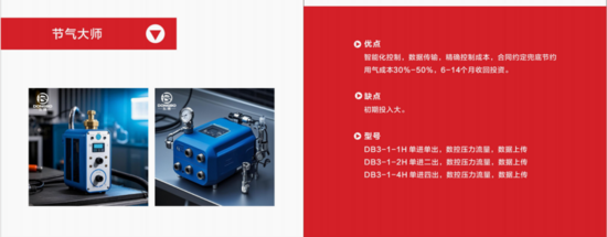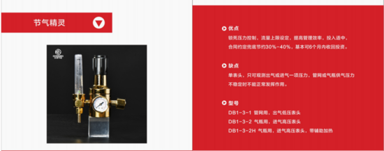 在全球工业能耗日益扩大的状态下,公司针对制造业当中需要的焊接保护气体的节能方向展开研究,成功研发了初始产品“东博牌二级减压阀”,其特点是通过产品精密的对保护气体管网或气瓶供气压力及流量的有效控制,达到焊接生产的基本需求,保证焊接质量的前提下,不造成气体浪费。营销策略上采取“合同约定兜底制”确保30%+节气率,让客户回本周期在6个月内等硬指标营销政策。达不到合同约定即退款退货,恢复原貌等硬性措施,让客户放心使用,同时也体现了产品的优质质量和高效使用效果。