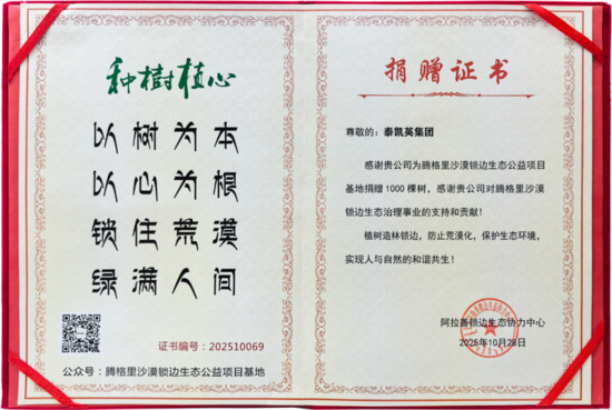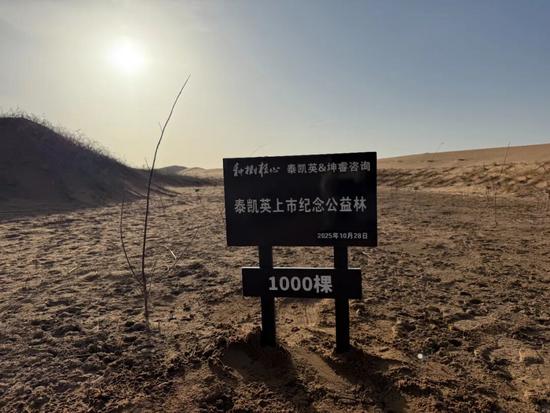 10月28日,泰凯英正式登陆北交所。这一天,合作伙伴坤睿咨询以泰凯英名义,向内蒙古腾格里沙漠锁边生态公益项目基地捐赠1000棵树,以独特的绿色行动纪念这一特殊时刻,对此,泰凯英深表谢意。