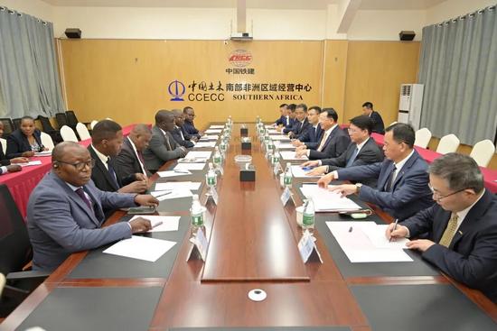 当地时间11月18日,中国铁建董事长戴和根在赞比亚首都卢萨卡同赞比亚商业、贸易与工业部长穆伦加举行会谈。