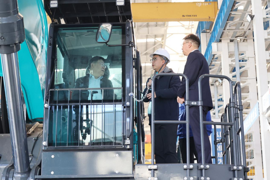 王漠一行先后参观了挖掘机总装车间与山河矿岩车间,详细了解山河智能在重型装备、矿山装备等方面的研发成果与生产工艺,并现场体验了部分设备的操作与性能。随后,王漠一行参观了企业文化展厅,了解企业发展历程和技术积淀。