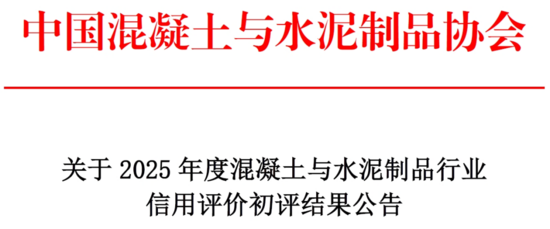 根据《中国混凝土与水泥制品行业信用评价管理办法》,按照公平、公正、公开的原则,经会员单位自评申报、第三方评价机构评审、协会信评工作领导小组审核,并在相关媒体上公示,确定了2025年度混凝土与水泥制品行业信用评价结果,现予以发布。