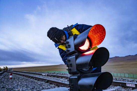 “风卷沙石跑,氧气吃不饱,四季穿棉袍”,这是对青藏铁路格拉段恶劣自然环境的真实写照,那里风沙肆虐、四季飞雪,空气含氧量仅为平原地区的50%,被视为“生命禁区”。奔波于高原风雪中,小伙子们无畏艰险,用脚步丈量责任,用青春守护信号设备的安全稳定,为高原天路的安全畅通保驾护航。