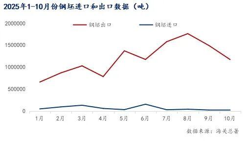 海关总署数据显示:2025年1-10月国内钢坯出口总量共计1190.35万吨,年同比增加157.22%;国内钢坯进口总量共计63.63万吨,年同比减少62.61%