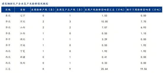 根据Mysteel调研,本周建筑钢材企业检修及复产规模明显缩小,影响产量有所下降。具体来看,本周有9个省份的钢厂涉及产线检修、复产,其中检修产线8条、较上周减少4条,复产产线9条、较上周减少10条,按照轧机日均产量测算,产线检修影响产量25.64万吨、较上周下降3.67万吨,预计下周产线检修影响产量19.56万吨。