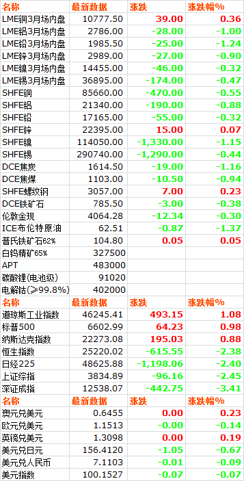 1121日,LME六种基本金属价格跌多涨少。三月期铜价收于10777.5美元吨,上涨0.36%。三月期铝价收于2786美元吨,下跌1.00%。三月期铅价收于1985.5美元吨,下跌1.24%。三月期锌价收于2989美元吨,下跌0.90%。三月期锡价收于36895美元吨,下跌0.47%。三月期镍价收于14455美元吨,下跌0.32%