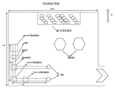 (四)事故现场勘查情况经现场勘查,事故发生地点为丰固水泥公司厂区西南角的破碎车间,为长约40米、宽约30米、高约15米,四面围墙的长方体钢铁结构厂棚。东面开门;西面靠墙由北向南依次安装有600*900颚式破碎机(俗称大机)、磁铁、锤式破碎机和400*600颚式破碎机,中间由输送带连接,总长约15米;南面靠墙并排安装有两条输送带,靠里面的输送带中间有250*1200颚式破碎机(俗称1米机)并连接400*600颚式破碎机,靠外的输送带连接锤式破碎机,总长约15米,输送带向东终端下方呈锥形堆积有已经破碎的少量成品;设备沿西墙、南墙呈7字型连接分布;北面靠墙堆积有矿石原料,长约15米、宽约3米、高约1.5米;车间中间靠东呈锥形堆积两堆成品,直径约4米、高约1.5米。