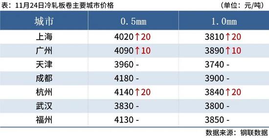 冷轧板卷:1124日,全国24个主要城市1.0mm冷卷均价3903元/吨,较上一交易日上涨3元/吨。早间各地商户报价暂稳观望,热卷期货盘面震荡上行,下游采购积极性有所增加,上午报单计划增多,部分市场成交尚可,下午后小幅上调价格,整体成交量增加。心态方面,据了解当前市场商户对后期行情走势多观望,且临近年末操作谨慎以求稳为主,降库控制风险。综合来看,预计25日全国冷轧板卷价格偏稳运行。