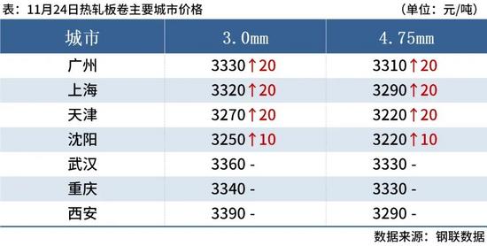 热轧板卷:11月24日,全国24个主要城市4.75mm热轧板卷均价3319元/吨,较上一交易日价格上涨9元/吨。黑色系期货震荡上行,热卷冲高回落。需求端来看,终端固定资产投资、房地产投资等数据持续走弱,需求预期持续偏悲观。供应来看,终端需求进一步回落,部分钢厂销售压力较大,生产积极性有所下降,主动选择减少生产时间以压减产量,后期钢厂检修装置或将增多,预计25日热轧板卷或将持稳运行。