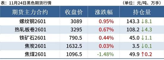 焦炭:11月24市场价格暂稳运行,焦炭价格已经连续上涨4轮,叠加近期原料端焦煤价格陆续回调,焦企利润明显改善,整体开工小幅回升,但市场情绪有所转变,部分焦企厂区焦炭库存少量堆积。下游方面,铁水产量相对高位,多数钢厂补库节奏尚可,短期内焦炭需求仍有支撑。不过随着钢厂陆续减产检修,叠加焦煤成本坍塌,短期焦炭或有降价预期