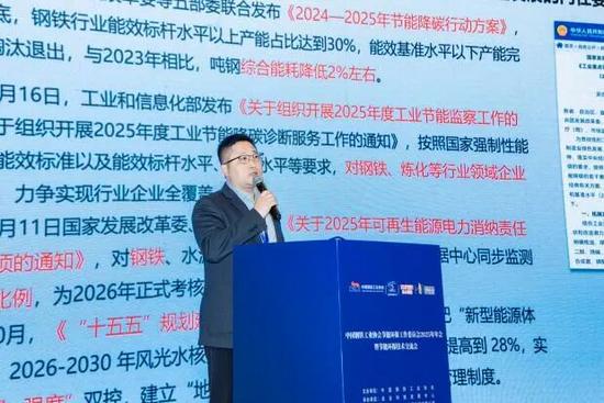 姜维在讲话中系统梳理了“十四五”以来钢铁行业节能环保工作的三大显著成效。一是钢铁行业在减量发展的“十四五”积累的宝贵经验为中国钢铁健康可持续发展增添了新的成色。进入“十四五”以来,国内钢铁表观消费连续4年下降,钢铁产量总体下降趋势其中国内表观消费2020年10.4亿吨峰值下降到2024年的8.9亿吨,下降了1.5亿吨,年均下降3.8%2025年前季度国内表观消费量为6.49亿吨,下降5.7%,下降幅度进一步加大。钢铁行业积极探索,逐步形成坚持“三定三不要”的行业共识,行业自律意识、能力逐步提升。二是“十四五”钢铁行业超低排放攻坚破局取得卓越成果。截至今年10月底共有219家钢铁企业完成或部分完成超低排放改造和评估监测其中,165家钢铁企业完成全工序超低排放改造,涉及粗钢产能约6.63亿吨,吨钢超低排放改造投资约447.06元,吨钢平均环保运行成本约为212.44元;54家钢铁企业完成部分工序超低排放改造公示,涉及粗钢产能约1.88亿吨;行业全面完成超低排放改造的投入已超3100亿人民币。三是极致能效工程系统挖潜,为节能降本增效做出贡献。截至目前,四批申报“双碳最佳实践能效标杆示范厂”培育企业共143家,涉及产能约7.5亿吨,为全行业达到节能目标、实现降本增效起到了积极推动作用。能效标杆示范创建工作得到了行业高度认同和积极参与。截至2025年11月中旬,共21家企业完成极致能效验收公示,10家企业以“双碳最佳实践能效标杆示范企业”进行公示,11家企业以“双碳最佳实践能效标杆示范工序/设备”进行公示2025年底40家培育企业有望达到国家标杆水平。姜维表示“十五”是国家碳达峰的关键五年,钢铁行业作为传统产业要积极融入碳市场,加快低碳技术进步,努力实现减污降碳、节能降耗,努力实现中国钢铁低碳转型和健康可持续发展双赢