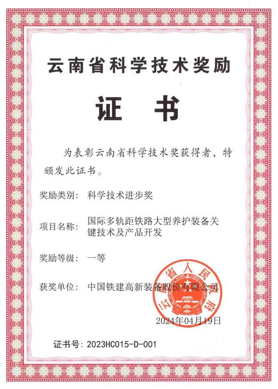 2024年9月,铁建装备实现多轨距铁路养护技术重大突破,斩获云南省科学技术进步奖一等奖