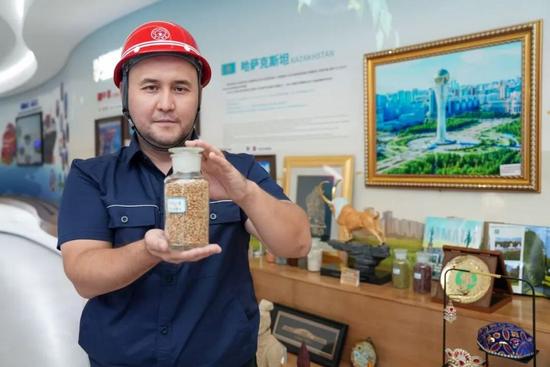 阿金汉展示从哈萨克斯坦过境连云港、运至东南亚的小麦样品。拍摄于2024年7月25日,新华社照片。