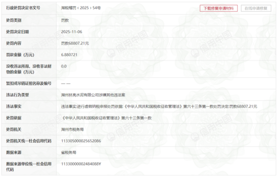 湖州林亮水泥有限公司(统一社会信用代码:91330502786405412C)也因相同性质的税收违法行为,被湖州市税务局依据同一法律条款处以罚款68,807.21元(文号:湖税稽罚(2025)54号)。