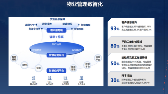 物业管理数智化:搭建智慧空间平台、智慧运营平台以及客户端,提升物业服务及管理水平,客户满意度提升93%,工单处理时长缩减 80%,降低50%巡检频次以及工作量。典型场景包括:利用 AI 巡检提升15倍巡检频次,提升80%响应速度。利用多模态大模型进行车场审计,替代 90% 人工复核工作。通过 AI 冷站智控、能耗监测等技术,实现公区能耗节省 27%,降低运营成本。