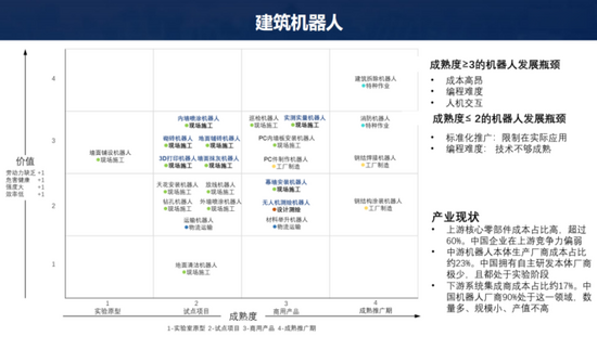 建筑机器人:应用成熟度较高的机器人集中在高危场景(如拆除、消防机器人),清洁、施工类机器人受成本限制,尚未大规模普及。