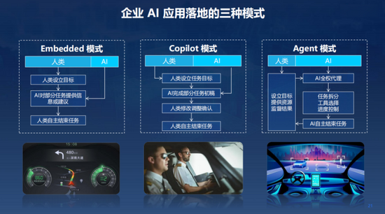 Agent 模式:人类设定目标并监督结果,AI 自主完成任务拆分、工具选择、进度控制,落地案例尚不成熟。