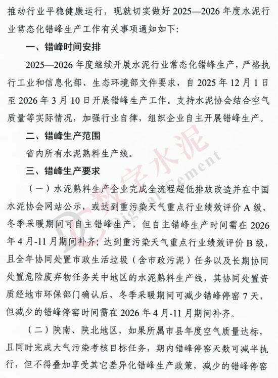 11月25日,陕西省工业和信息化厅 陕西省生态环境厅关于做好2025—2026年度水泥行业常态化错峰生产工作的通知要求,省内所有水泥熟料生产线自2025年12月1日至2026年3月10日开展错峰生产工作