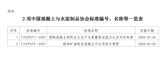 1126日,中国混凝土与水泥制品协会批准发布《预制混凝土构件企业生产与质量保证能力认定评价标准》《超细矿渣粉在混凝土中应用技术规程》项协会标准,自202626日起实施。