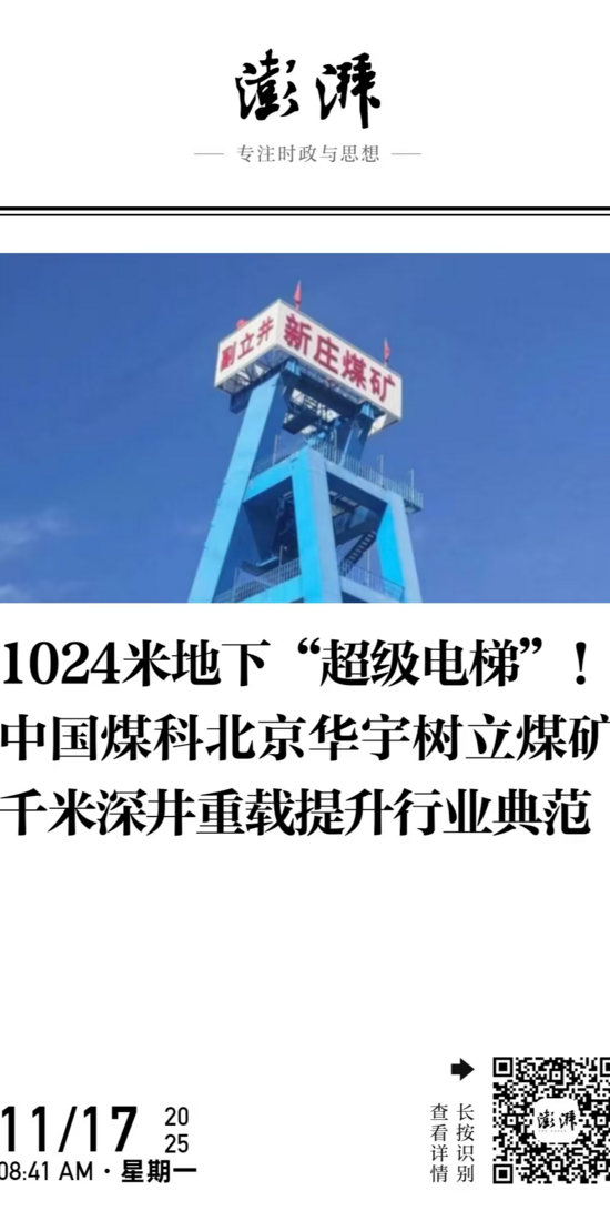 近日,科技日报、光明网、澎湃新闻等主流媒体对中国煤科北京华宇设计的新庄煤矿副立井提升系统进行了专题报道。该系统以“大重量、高效率”为核心,为煤矿千米深井作业面安全高效运输提供了坚实支撑。以下是媒体报道内容。