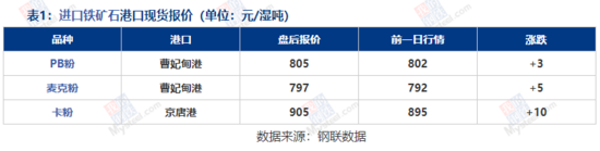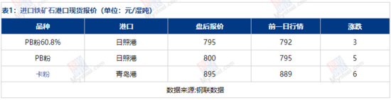 今日山东进口铁矿石现货市场价格小幅上涨,区域内贸易商报价积极性一般,截至目前成交几无;山东现货市场PB粉主力合约基差在i01+2附近;买盘方面,区域内钢厂按需补库,询盘较少。盘后报价较上一工作日下上涨3-6。