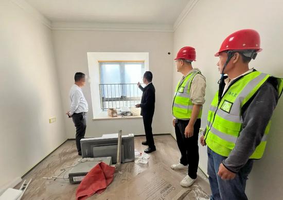 11月25日上午10时,海建置业分管工程的负责人谭先生带领海府大院项目销售负责人、海建置业快报快修队人员,与林先生一起查看验收房间整改的部位。