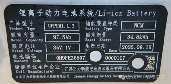 采用正力新能NCM97.5Ah电芯,额定容量34.8kwh。