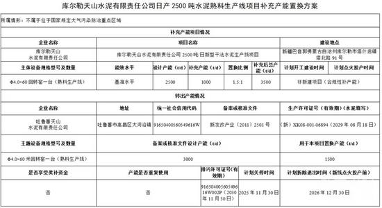 叶城天山水泥有限责任公司日产4000吨水泥熟料生产线项目、库尔勒天山水泥有限责任公司日产2500吨水泥熟料生产线项目补充产能置换方案