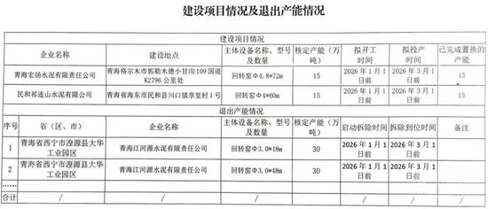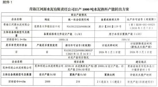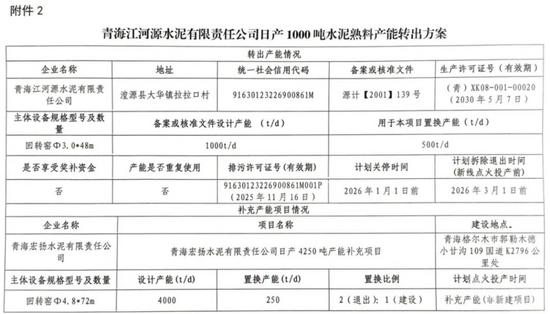 青海江河源水泥有限责任公司1000t/d水泥熟料线,分别用于民和祁连山水泥有限公司2250t/d水泥熟料线和青海宏扬水泥有限责任公司4250t/d水泥熟料线项目置换产能,该生产线计划2026年3月1日前拆除退出。