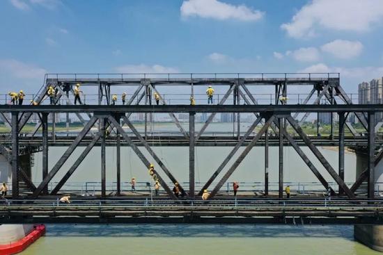 烈日下的桥隧工检修铁路大桥。单新元 摄