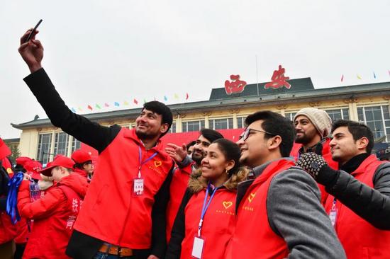 春运期间,来自哈萨克斯坦、古巴等国家的留学生志愿者在西安站打卡留念。唐振江 摄