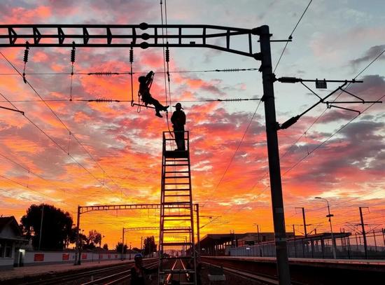 供电职工在霞光下检修接触网。赵文櫆 摄