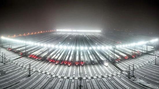 一列列动车组停靠在武汉动车段存车场,形似“陆地航母”。邹政 摄