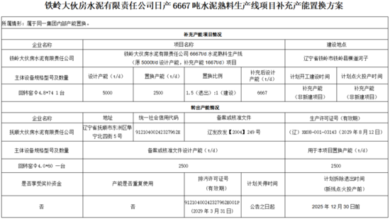 根据公示,铁岭大伙房水泥有限责任公司6667t/d水泥熟料生产线项目原设计产能5000t/d,补充产能1667t/d,置换比例为1.5:1。抚顺大伙房水泥有限责任公司2500t/d水泥熟料生产线用于本项目置换产能,计划2025年12月30日前拆除退出。