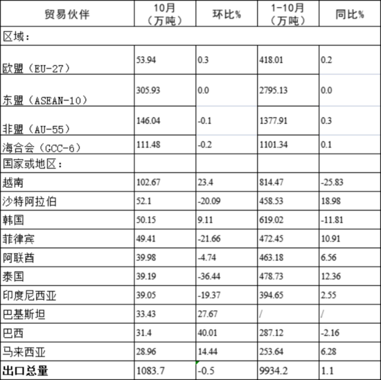 10月,我国对东盟(ASEAN-10)、非盟(AU-55)、海合会(GCC-6)及欧盟国家出口钢材数量环比基本持平。