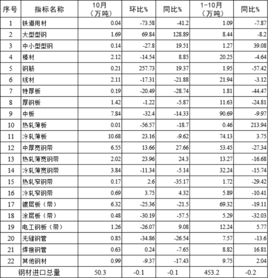 10月,2大类钢材品种中,有8类品种进口量环比增长,环比下降的14个品种中,降幅超过10%的品种有12个,但单月进口量均小于1万吨;单月进口量前5位的品种中,只有2个产品进口量环比出现增长,钢筋环比增幅达257.73%10月,冷轧薄板累计进口量呈现同比略降态势;中板累计进口量同比降幅收窄。10月,除了厚钢板、中板和镀层板(带)进口单价保持相对稳定,其余多种进口产品的单价波动较大10月,我国钢坯进口量环比大幅增长,进口单价环比大幅下跌。