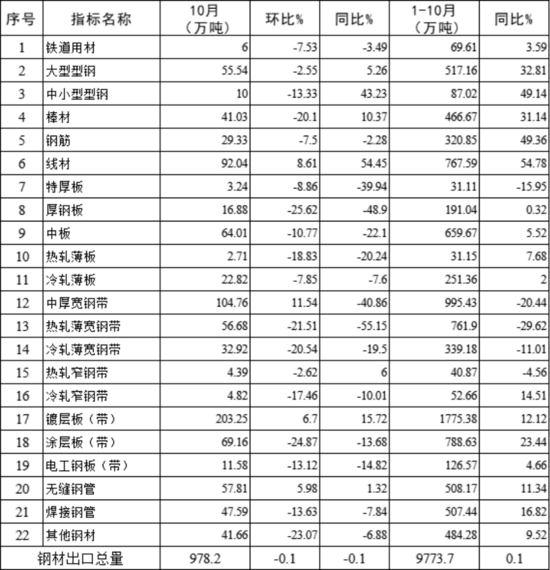 02510月,我国钢材主要品种出口总量与上月比略降。线材和中厚宽钢带出口增长明显。