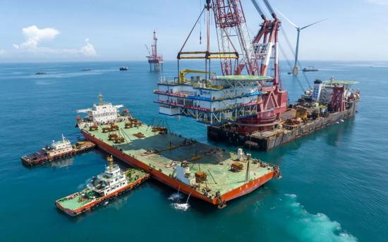 依托该项目,中铁大桥局研发形成了复杂海域导管架基础施工成套技术,涵盖大直径超长钢管桩深水施工、深水先桩法四桩导管架快速安装、三筒吸力式导管架基础施工等。这些技术为深远海风电规模化开发建设奠定了坚实基础。