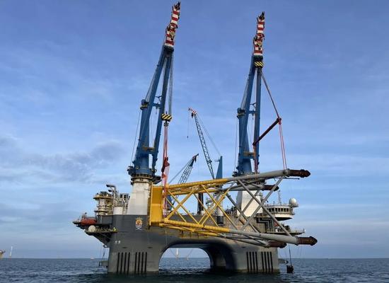 在如此复杂的环境下,建设者需将导管架精准插入4根钢管桩内,这意味着在40米深的水下,4根钢桩的相对位置精度须控制在75毫米以内,桩顶标高误差不超过50毫米,技术挑战前所未有。