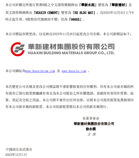 公告指出,公司的H股中文证券简称将由“华新水泥”变更为“华新建材”,英文证券简称将由“HUAXIN CEMENT”变更为“HX BLDG MAT”,而H股股份代号保持不变,仍为“06655”。此外,公司标志也将随名称变更而更改,但此变更不会影响股东的任何权利,现有已发行股票将继续有效。