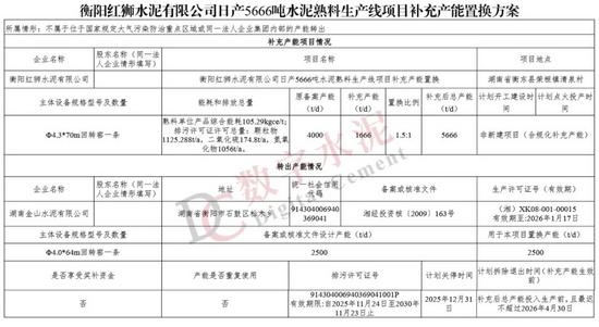 根据公示,衡阳红狮水泥有限公司日产5666吨水泥熟料生产线项目原备案产能4000t/d,补充产能1666t/d,置换比例为1.5:1。湖南金山水泥有限公司2500t/d熟料线用于本项目置换产能。