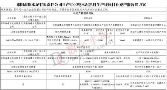 祁阳海螺水泥有限责任公司日产6000吨水泥熟料生产线补充产能置换项目原备案产能4000t/d,补充产能2000t/d,置换比例为1:1。