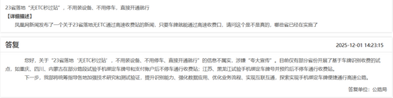 近日,一篇名为《23省落地“无ETC秒过站”,不用装设备、不用停车,直接开通就行》的文章在网络上流传,一网友就此事在交通运输部官网留言咨询。交通运输部公路局进行了如下回复: